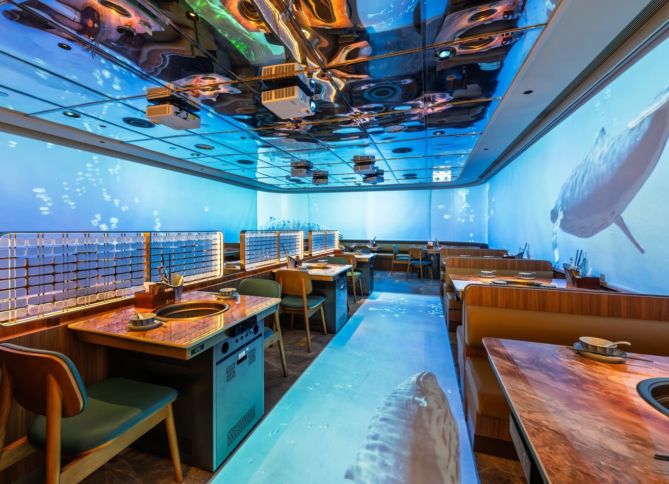 除咗食得好,美人漁嘅裝修簡直係為打卡而生。全場採用咗先進嘅 3D 沉浸式投影技術,牆身佈滿流動嘅水母同熱帶魚影像,配合埋幻彩燈光,令你同另一半好似置身喺深海世界入面食火鍋。環境非常有氛圍感,甚至連桌面都會有互動投影效果,帶嚟感官同味覺嘅雙重享受。