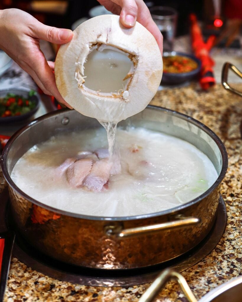 「去滾」嘅湯底名起得夠晒抵死,但火鍋用料絕對唔講笑。如果你同另一半想滋補吓,可以揀「癡膠花癲雞(花膠雞燉翅)」,湯頭金黃粘稠,啖啖都係膠原蛋白。再唔係可以試吓「原個椰子雞湯」,現場即叫即開新鮮椰子,直接喺你面前將椰青水灌入個煲度。