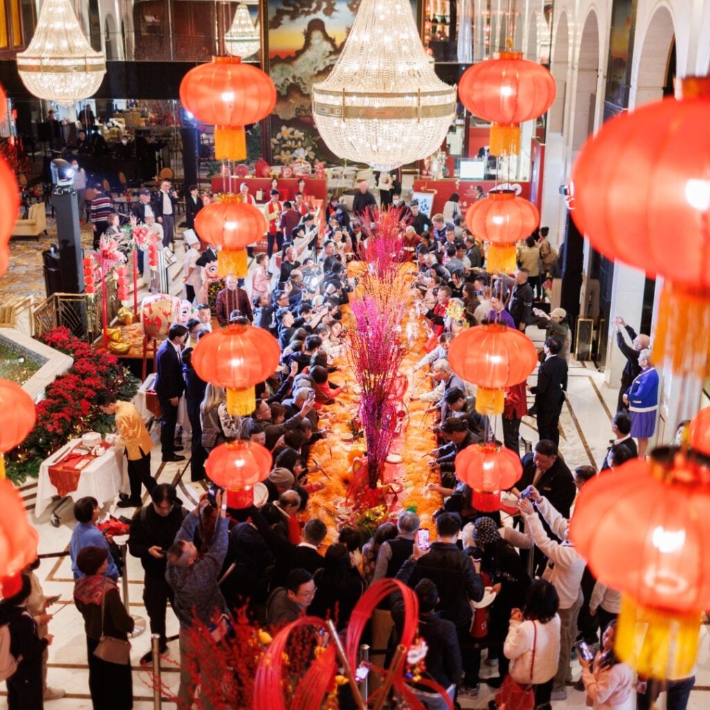 於大堂茶座以華麗繽紛嘅新春下午茶迎接新歲。精緻甜鹹美點以吉祥金柑與喜慶炮竹為靈感,匠心融入帝皇蟹、魚子醬及三文魚籽等矜貴食材,寓意福氣臨門、好運連綿。