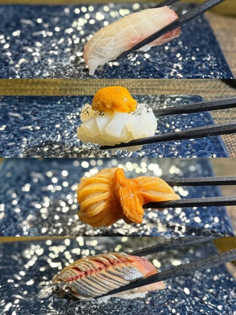 午餐 omakase 最便宜只需 $380,也有多點菜式的 $580 套餐選擇;晚市則有 $900、$1,200 及 $1,500 的選擇,包括前菜、握壽司、燒物、手卷等等。