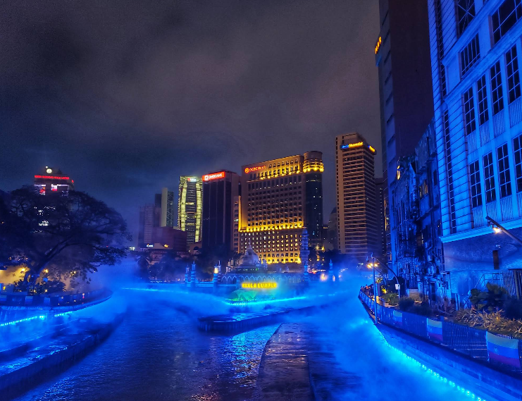 夜里的 River of Life 是另一种 KL。蓝色灯光把河面染成深邃的颜色,雾气在水面轻轻飘,远处的老清真寺像一幅安静的剪影。这里的节奏比商场慢很多,很适合拍一些安静、耐看的头像:不是大笑,而是那种轻声说话、一起看水的瞬间。