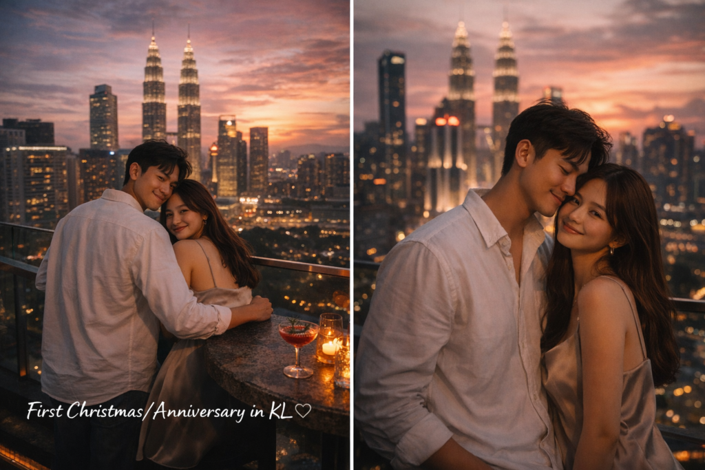 高层的电梯门一打开,风就先扑过来,城市的灯像撒在脚边的星星。无论是有无边泳池的天台,还是玻璃幕墙外的露台,一站上去就会明白:KL 的夜景其实很适合拍高级感情侣写真。远处是 Twin Towers 和灯火交错的街道,近处是一桌酒杯和昏黄的台灯,一切都很适合慢慢地被记录下来。