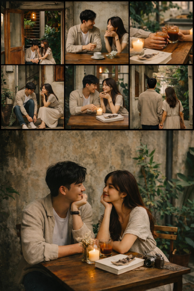 情侣可以在这里玩“生活记录风”的拍法:一人坐在院子小桌边喝咖啡,另一人从门口走进来;或者一起倚在窗边,让光从侧面打进来,只拍你们的侧脸轮廓和交错的手指。也可以拍一组“半隐身”的照片——只露背影、手、鞋子,不一定要看镜头。穿搭可以往自然色靠拢:米白衬衫、亚麻材质、牛仔、简单帆布鞋,这些都不会和背景打架。发帖时,很适合做成“Weekend reset / 小院约会日”的图文,头像则选一张带绿意和光影的半身照,看起来轻松、干净、但又很有温度。
