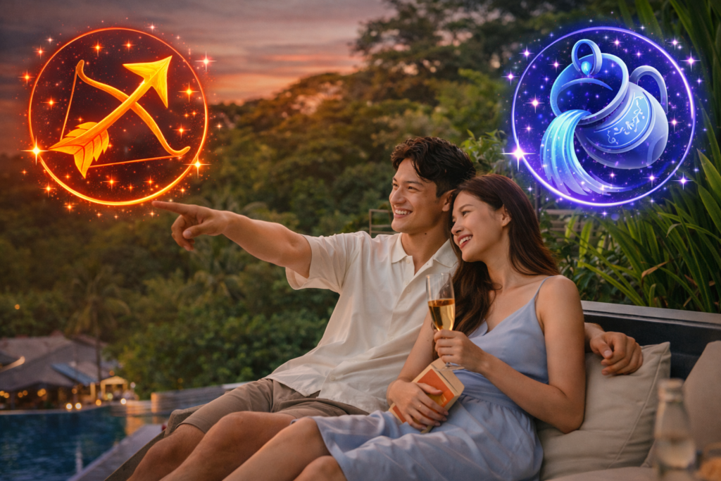 射手和水瓶的组合,很像两个人一起开了一个「只有我们听得懂」的电台节目。别的情侣进酒店第一件事是看床、看浴缸,他们两个先在阳台讨论窗外那块云长得像什么、如果辞职去旅行要怎么办理保险。行李还没完全打开,话题已经绕了半个地球。